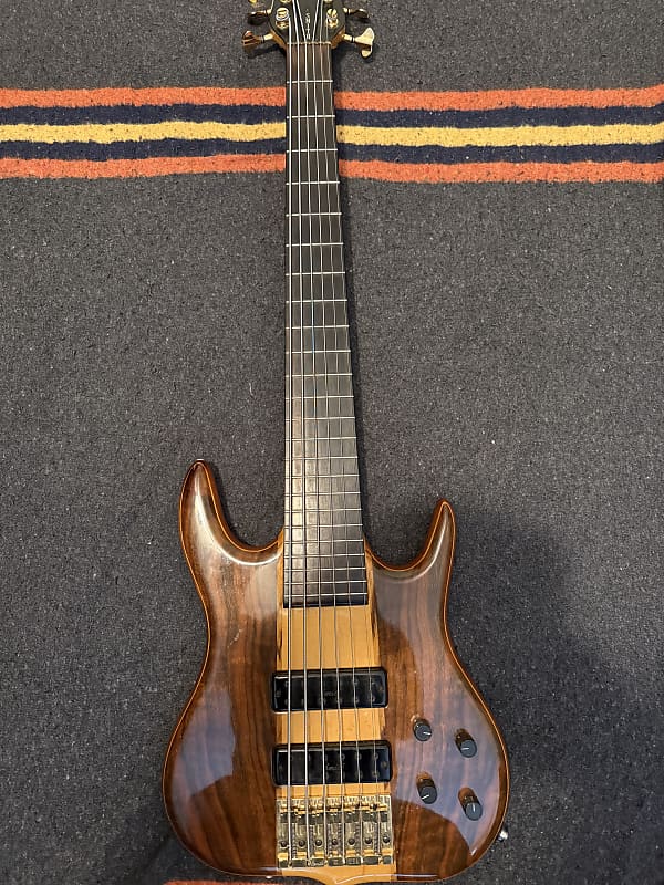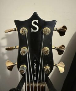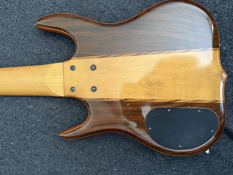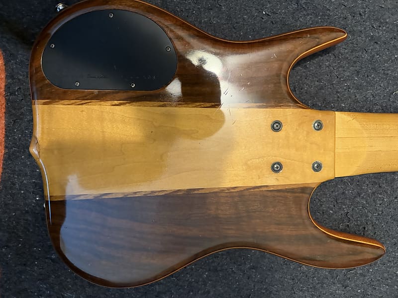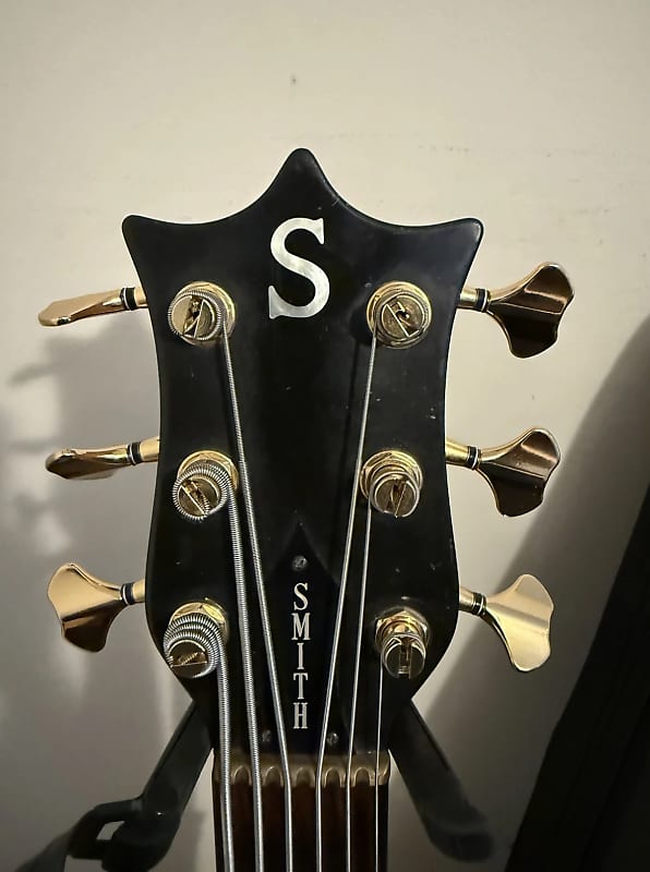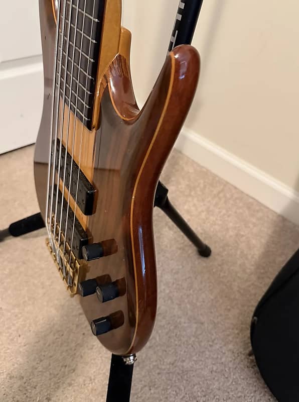 1993 Ken Smith C.R. 6 string Bass. Very good condition for a 32 year old bass that has been played. Finish has some “checking” due to aging and there are a some wear marks but no eye soars. Frets are fine and comes with a gig bag. This is a 4 knobber with volume, pan, bass and treble controls. 5 piece body with mahogany core and walnut top and back. Set up with low action and plays like a dream. Has the classic Smith tone,clean in an excellent condition.