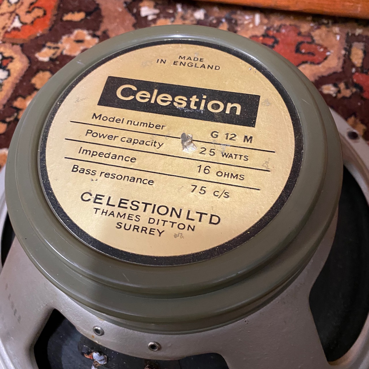 A brilliant pair of original Celestion G12M 25w T1511 12″ speakers from 24th and 28th October 1968. They work great and came out of a working cabinet. Original 014 cones. Great sounding!