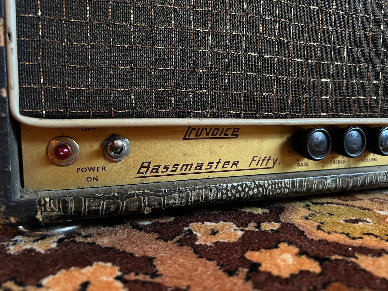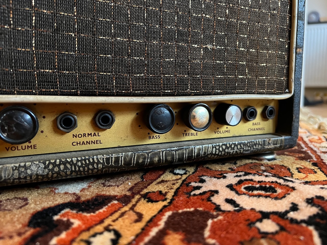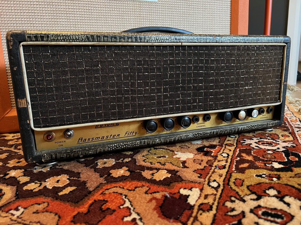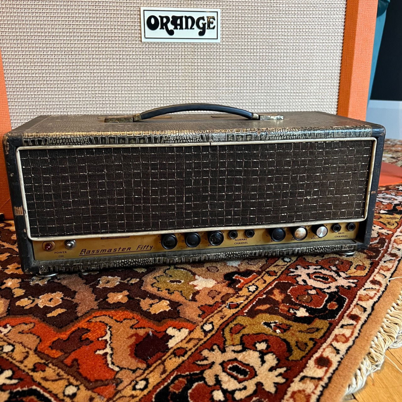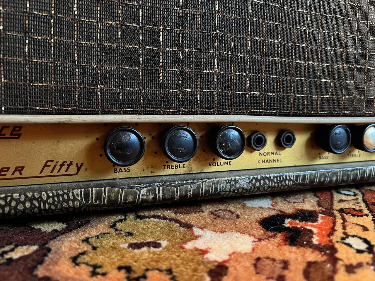 I’m a big Budgie fan so when this beauty was offered to me, I couldn’t refuse! It was apparently bought by the previous owner from Ray Phillips – long term drummer with Budgie. The amplifier itself is a really early 1962/1963 Bassmaster 50 in wonderful original condition including all the original valves inside. They include a Mullard GZ34, 2x Mullard EL34, and all original ECC83s too! The 3x transformers are original to the amplifier and work well.