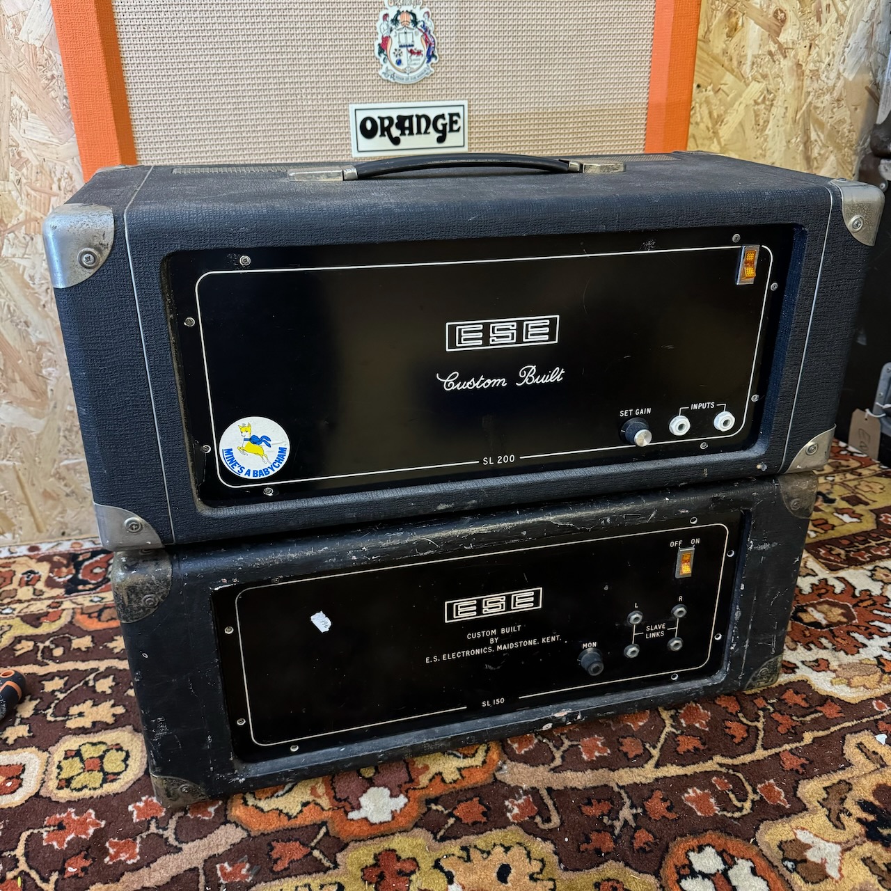 Yes, you will not find another pair like this. These were made by the legendary Eric Snowball (owner of the famous ESE store in Maidstone) in the 1970s. Every person who knew of Eric says how incredible he was at making (and fixing!) gear. These are a pair of slave amplifiers, one being an SL150 and the other a SL200. They’re both well used over the many years, and will require a little work to get up and running. My tech only does valve stuff, so these have slipped through (and someone will be getting a bargain!). They have Vox / Hiwatt / Marshall features, at a fraction of the cost too! Grab a bargain – I doubt you’ll see another pair like it!