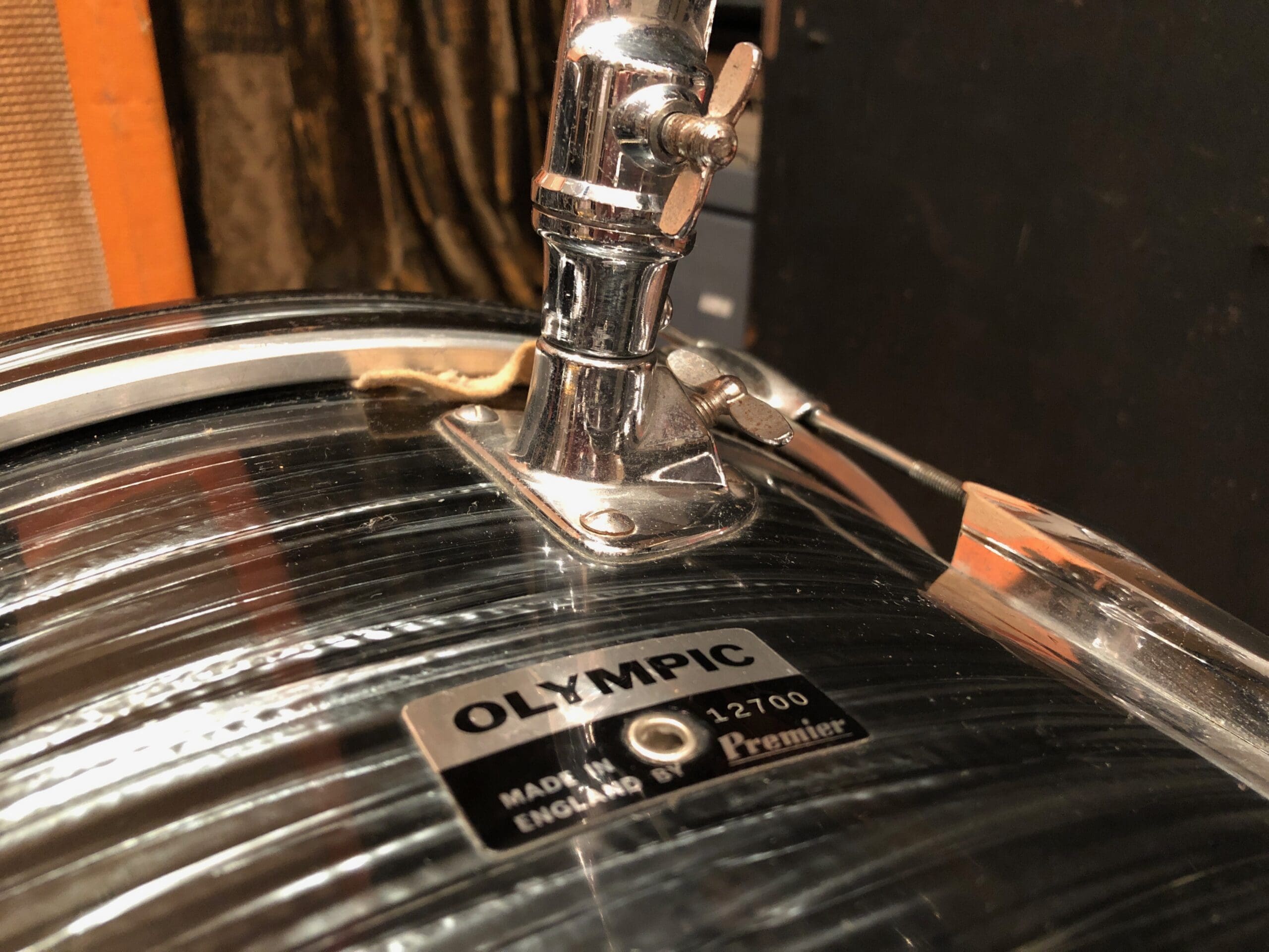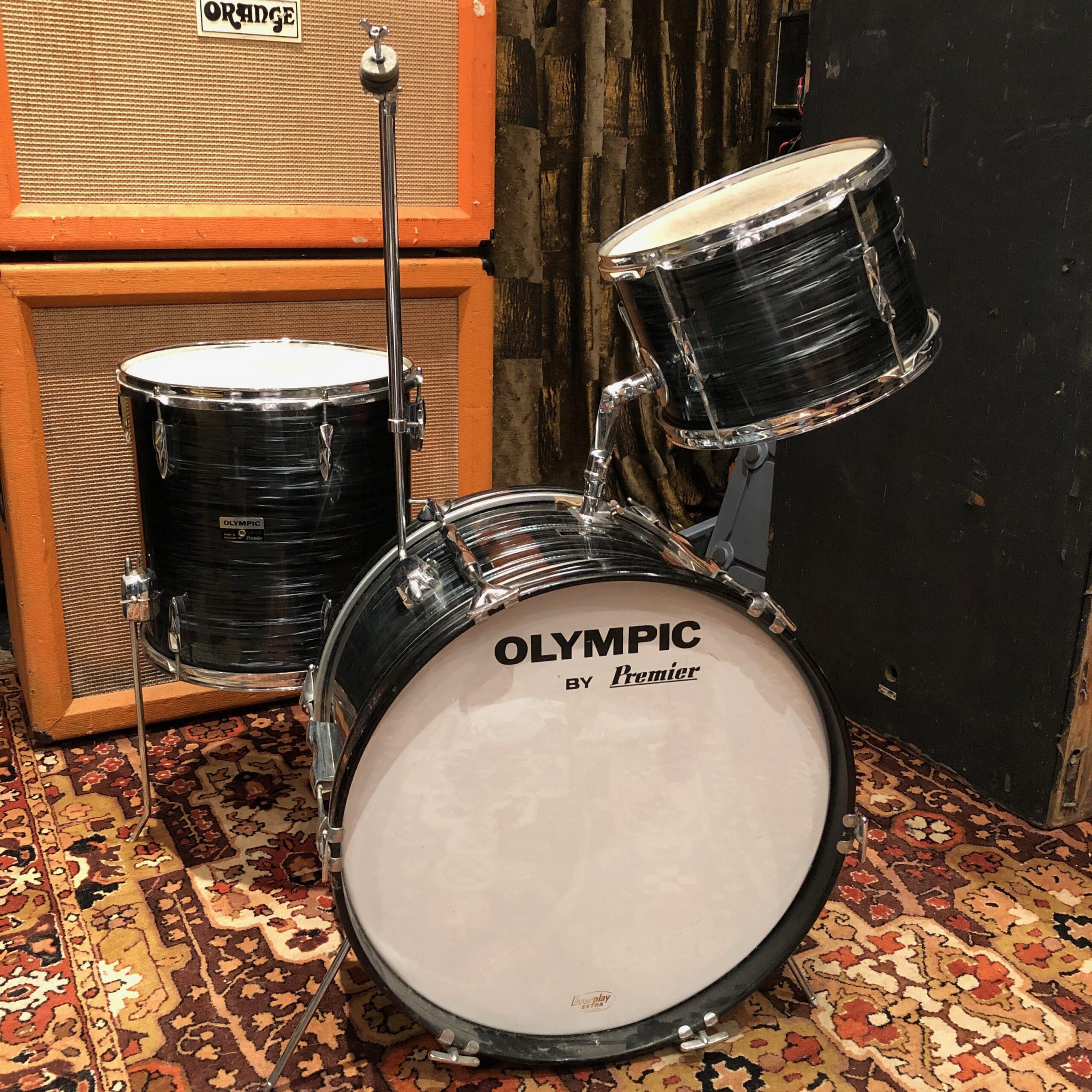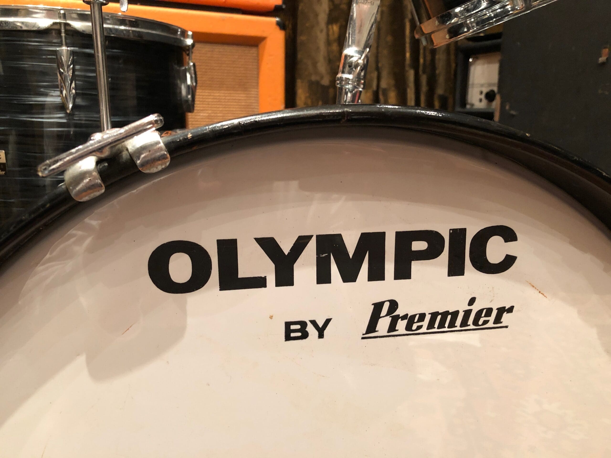 One owner, late 1960s or early 1970s Premier Olympic Jazz Size Drum Kit. Bass drum measures 20″, Floor Tom measures 14″ and the High Tom measures 12″. This comes complete, including the rare cymbal arm that was sold with the kit from new. What’s more, the skins are all Everplay skins, and the 5 digit serial numbers are extremely close. Although we deal mainly in guitars and amplifiers, we certainly appreciate a good kit and this is one of those! Cosmetically this is in great condition with no extra holes or repairs. The wrap is in good condition, with only a couple of light scratches to it, but nothing significant. A lovely playable kit as it is! There is a little bit of pitting to the metal parts. Please check out the in-depth pictures below as these form part of our description.