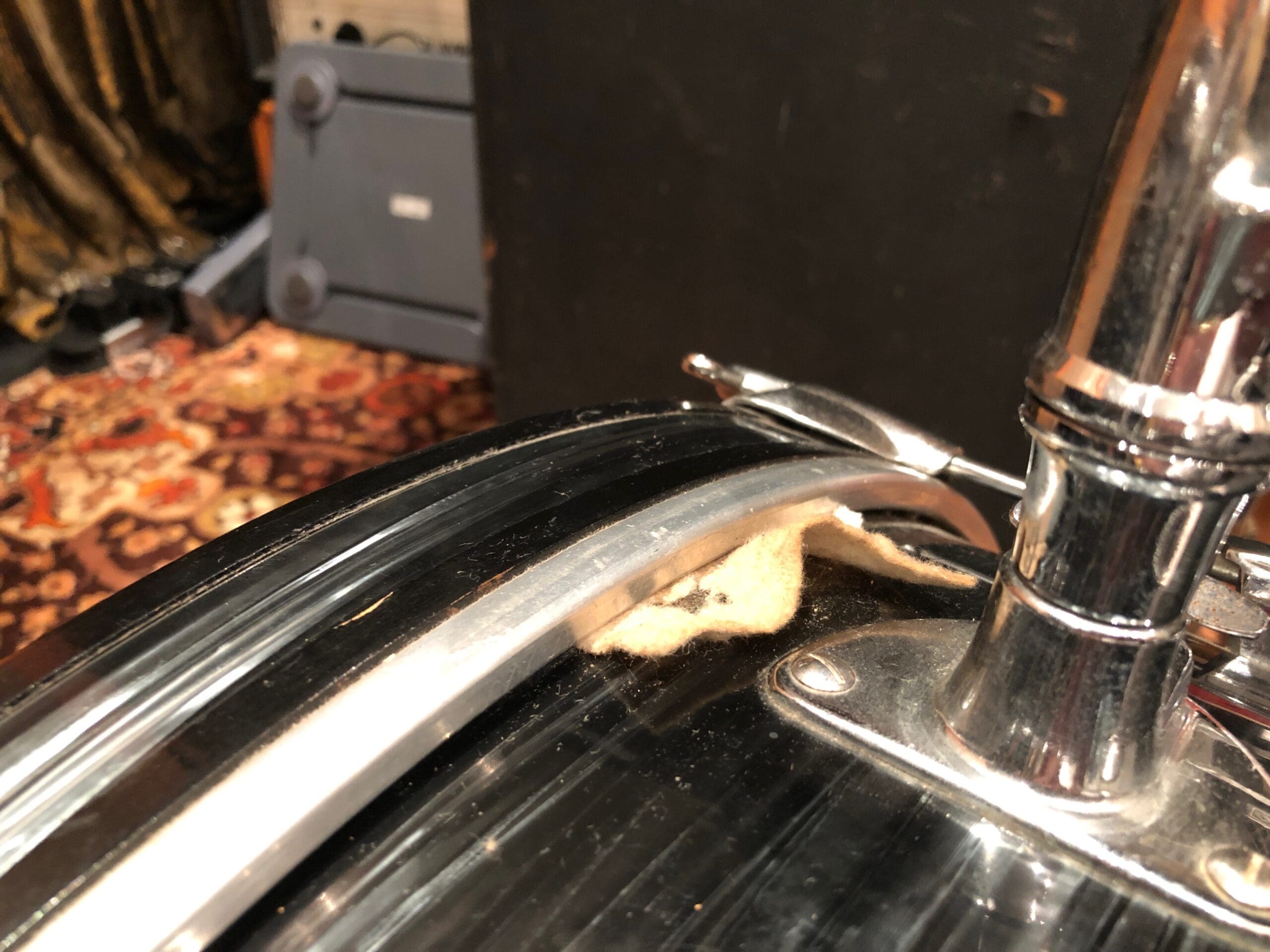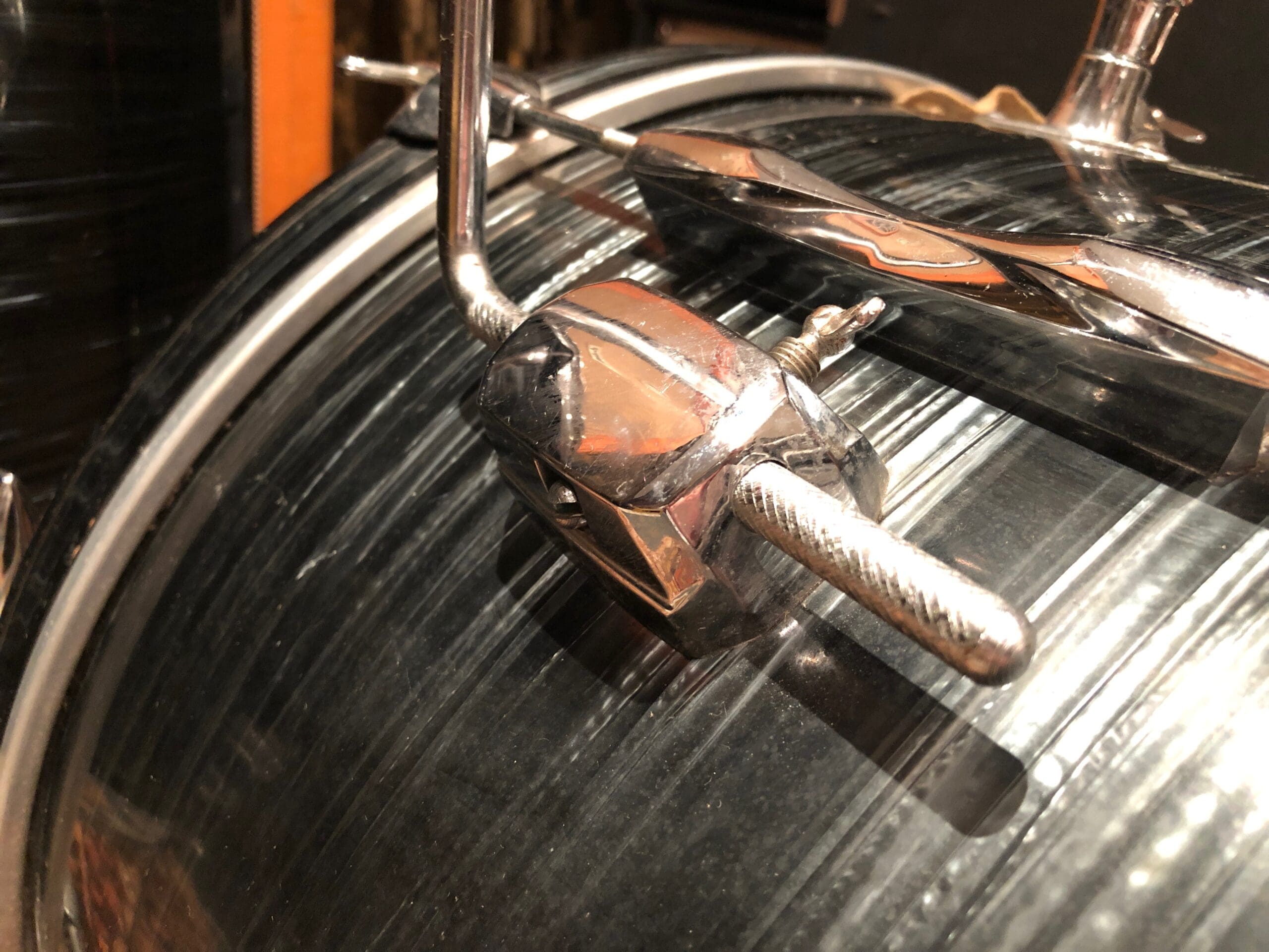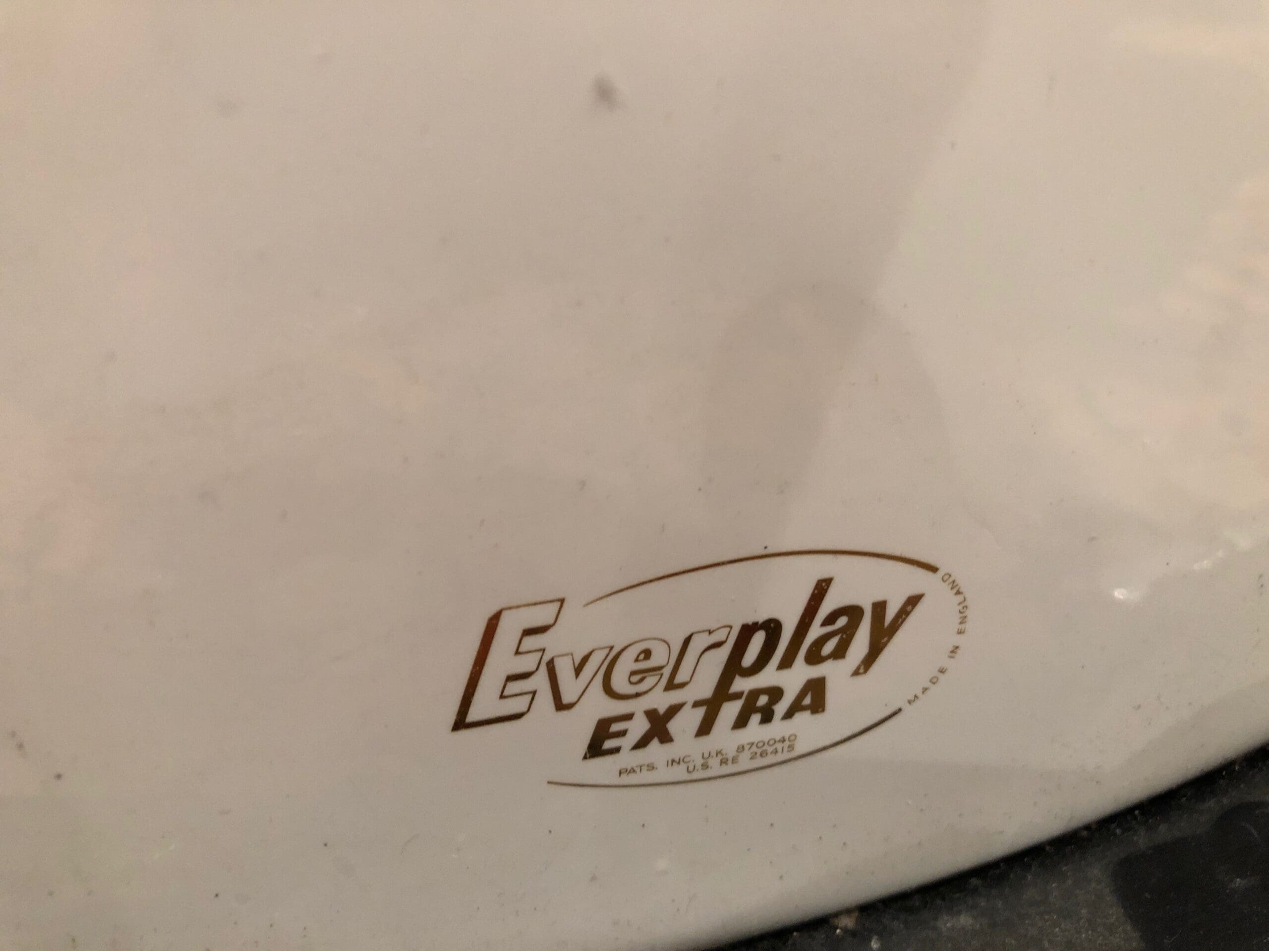 One owner, late 1960s or early 1970s Premier Olympic Jazz Size Drum Kit. Bass drum measures 20″, Floor Tom measures 14″ and the High Tom measures 12″. This comes complete, including the rare cymbal arm that was sold with the kit from new. What’s more, the skins are all Everplay skins, and the 5 digit serial numbers are extremely close. Although we deal mainly in guitars and amplifiers, we certainly appreciate a good kit and this is one of those! Cosmetically this is in great condition with no extra holes or repairs. The wrap is in good condition, with only a couple of light scratches to it, but nothing significant. A lovely playable kit as it is! There is a little bit of pitting to the metal parts. Please check out the in-depth pictures below as these form part of our description.